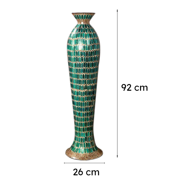 This indie-style floor vase is like a piece of art standing tall in your living room. With its conical shape and green mosaic pattern, its perfect for adding a splash of color. Who wouldnt want to spruce up their space with such a gem? And guess whatits made of metal so its durable too. But dont just take my word for it; imagine it by your couch, catching the late afternoon sun. Ah, the perfect spot for Sunday chai, windows open, breeze flowing in!